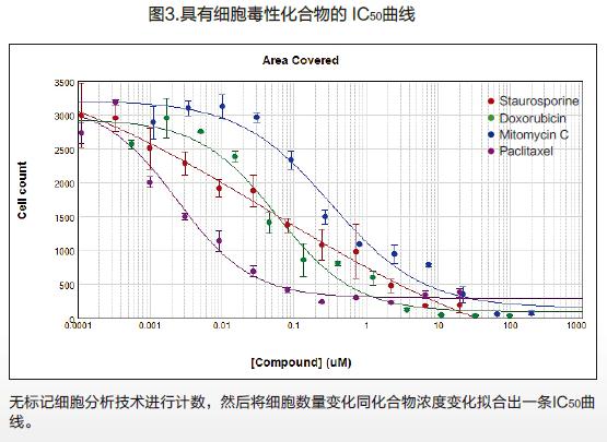 將Hela細胞按5000/孔的密度鋪在384孔板中并培養過夜。第二天使用幾種可誘導細胞死亡的化合物處理72小時,利用SpectraMax MiniMax細胞成像系統進行分析。無標記分析法計算處理后活細胞數量,并用Soft-Max Pro軟件繪制出其IC50曲線。結果顯示細胞對化合物的反應情況無需通過破壞性強的染色和脫色步驟也可被準確的檢測到(圖3)。