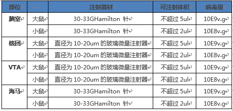 1.小鼠的操作通過尾靜脈注射的rAAV量推薦在10E11~12v.g數量級,體積推薦在100~200ul;針對腦部的感染建議用量參考下表: