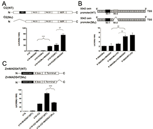 研究人員通過對ZmMADS47,O2以及50-kD醇溶蛋白的突變研究表明,O2可以通過和ZmMADS47的蛋白互作釋放ZmMADS47 C端的轉錄激活能力,從而促進下游醇溶蛋白的表達(圖7)。