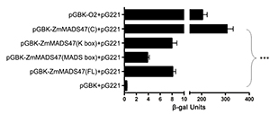 研究人員對ZmMADS47的全長蛋白以及分段蛋白進行了轉錄激活能力的檢測。結果發(fā)現(xiàn), ZmMADS47的C端不保守結構域則表現(xiàn)出了極強的轉錄激活能力(圖2)。該結果中,ZmMADS47全長則僅僅表現(xiàn)出了較弱的轉錄激活能力。這可能是由于ZmMADS47的C端轉錄激活結構域被全長包裹其中使得其轉錄激活能力的不到釋放,而在酵母體系中又缺乏一些能夠使其轉錄激活能力得以釋放的因子,從而導致ZmMADS47全長在酵母中相對于玉米籽粒天然狀態(tài)中的構型與修飾存在差異,從而影響了全長的轉錄激活能力。