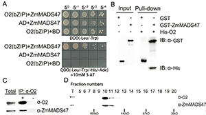 1.研究人員利用酵母雙雜交技術對O2蛋白的互作蛋白進行篩選,以期望能夠拓展O2在籽粒發(fā)育時期起到的作用機制。在酵母雙雜交實驗中,研究人員篩選到一個屬于MADS類轉錄因子家族的蛋白ZmMADS47,并且該蛋白與O2之間的互作通過GST Pull-down、coIP以及凝膠過濾實驗的驗證(圖1)。