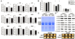 qPCR、SDS-PAGE、Western-blot對醇溶蛋白RNA和蛋白水平的研究發(fā)現(xiàn),α-zein和50-kD γ-zein的積累量都出現(xiàn)了一定程度的下降。但與o2突變體的opaque表型不同的是,ZmAMDS47 RNAi籽粒中并沒有出現(xiàn)明顯的opaque表型(圖3)。