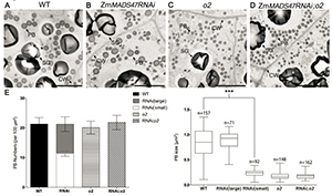 研究人員對ZmMADS47 RNAi籽粒進行了透射電鏡的觀察,結果表明,突變體的蛋白體大小分配上出現(xiàn)變化,并且部分蛋白體出現(xiàn)畸形(圖4)。