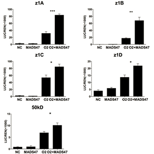 ZmMADS47與O2瞬時轉化洋蔥表皮細胞后發(fā)現(xiàn),ZmMADS47本身單獨不能激活下游靶標,而與O2一同轉化后,則可以不同程度的增加下游靶標的轉錄激活能力(圖6)。