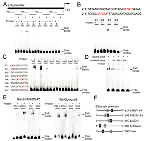 研究人員對ZmMADS47和醇溶蛋白啟動子的體外結合研究發(fā)現(xiàn),ZmMADS47可以結合α-zein和50-kD γ-zein的CATGT啟動子,并且和O2一同調控醇溶蛋白的表達(圖5)。