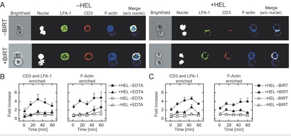 除了免疫細胞的吞噬之外,細胞間的相互作用還包括不同細胞通過配體受體的結合進行細胞間的信號轉導。最常見的是獲得性免疫反應中,T淋巴細胞與抗原遞呈細胞之間免疫突觸的形成。在正常細胞中,與免疫突觸形成相關的蛋白淋巴細胞功能相關抗原-1(LFA-1),細胞表面抗原CD3,以及F-actin均勻分布在細胞表面;而當免疫突出形成時,這些蛋白在兩個細胞接觸的位置發生凝集。正是根據這一機制,2009年,Babak H. Hosseini等人成功的使用成像流式技術檢測到HEL多肽處理細胞可以促進免疫突觸的形成,并將科研成果發表在PNAS上。由此也證明成像流式在檢測免疫突觸形成中獨有的優勢。