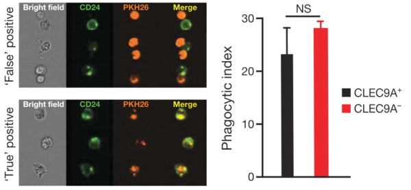圖一:通過左側成像流式結果圖可以清楚的判別細胞黏連體(’False’ postive)和發生吞噬的細胞(’True’ positive),從而排除了假陽性結果的干擾。