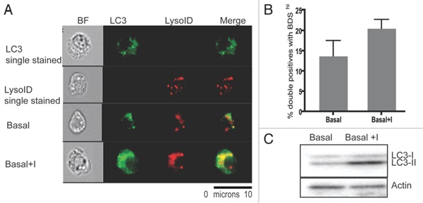 自噬是細胞在演變進化的過程中保留下來的一個分解代謝過程,其主要是將胞漿內的物質運輸到溶酶體內進而被分解代謝,藉此實現細胞本身的代謝需要和某些細胞器的更新。研究自噬的傳統方法主要是通過熒光顯微鏡或者共聚焦觀察自噬小體/自噬溶酶體的形成。由于顯微鏡的視野限制,無法進行高通量樣本或者混合細胞樣本,比如臨床血液樣本進行分析。2012年,Kanchan Phadwal等人在《Autography》發表題為“A novel method for autophagy detection in primary cells”使用量化成像流式技術對人血中白細胞旳自噬進行了量化分析,并且通過對原代細胞和細胞系自噬的相關基因的研究,證實了T體細胞的自噬活性明顯高于B細胞,而隨著DNA損傷水平的升高CD8+ T細胞的自噬明顯下降。從而為隨著年齡的增長,免疫系統功能下降提供了合理的解釋。