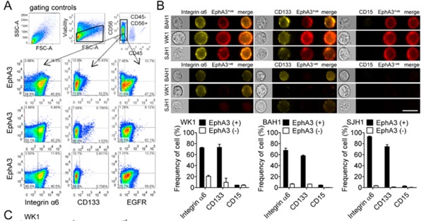 圖4:由成像流式圖像可以看到標記熒光的EphA3的分布區域,主要在細胞膜上,且在Integrin α6和CD133陽性的細胞中高表達。 對這些細胞進行統計學分析,證實EphA3高表達是有統計學意義的。 |