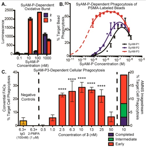 盡管傳統化學類抗腫瘤藥物的研發遇到了瓶頸,但是由于化學修飾相對簡單方便,并且經化學修飾過的抗原抗體特異性和親和力都會有所提高;因此,在CAR-T的研究中化學修飾依舊有著很大的應用潛力。耶魯大學的Patrick J. McEnaney等人設計合成了一類被稱為“synthetic antibody mimics targeting prostate cancer (SyAM-P)”的化合物,這類中等分子量(~ 7000 Da)的化合物同時具有抗體的結合與效應能力,因此可以有效的將免疫細胞和前列腺癌細胞特異性地結合在一起,從而增強免疫細胞對癌細胞的特異性識別和吞噬。這一發現于2014年12月16日發表在化學類的權威雜志JACS上,為CAR-T的研究提供了新思路。