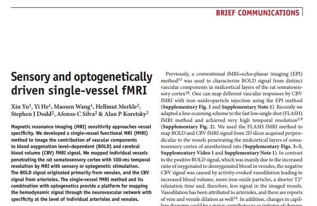 Yu, X., et al., 2016. Sensory and Optogenetically Driven Single-vessel fMRI. Nature Methods, DOI: 10.1038/nmeth.3765.
