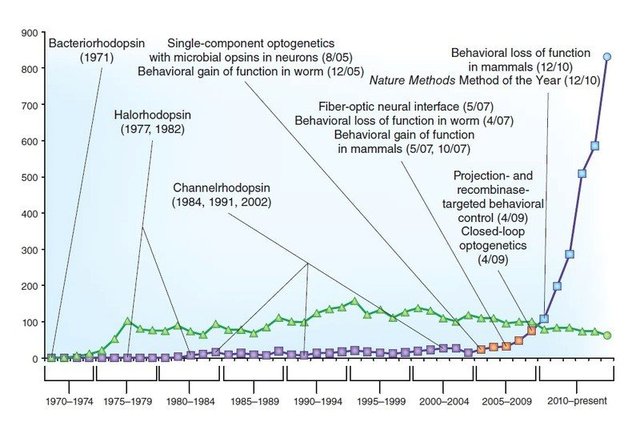 Nature Methods雜志在十周年之際推出了紀(jì)念特刊,點評了在過去十年中對生物學(xué)研究影響最深的十大技術(shù),其中就包括光遺傳學(xué)技術(shù)。應(yīng)用這個方法,針對動物行為學(xué)的研究可謂是突飛猛進(jìn)。