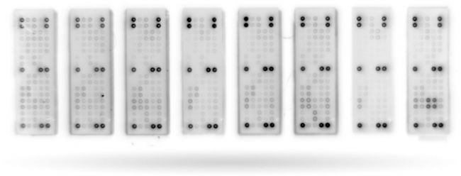 抗體陣列印跡膜與夾心式ELISA類似,將樣品加到膜上,蛋白與抗體特異性結合從而被捕獲,之后利用被標記的二抗進行檢測。下述圖像為使用化學發光成像結果。