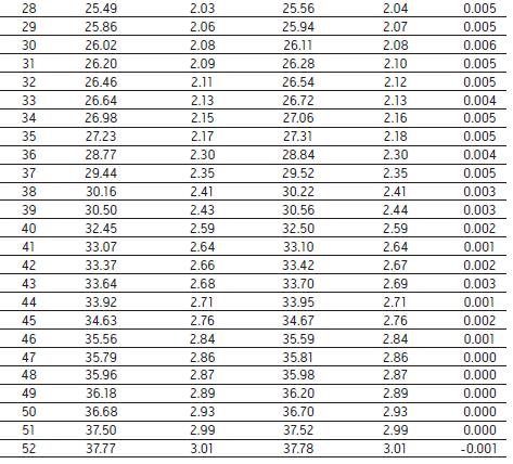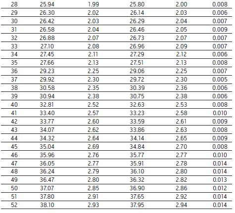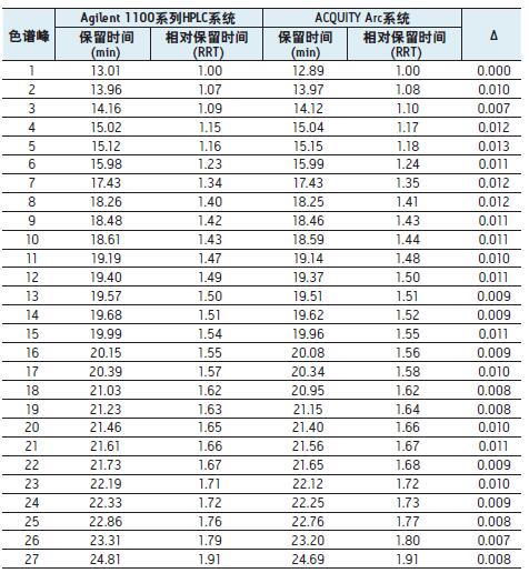 表1. 比較圖1中Agilent 1100系列HPLC系統和ACQUITY Arc系統鑒定出的52個色譜峰的保留時間。采用Gradient SmartStart技術補償兩個系統之間的延遲體積差異。通過計算所得的