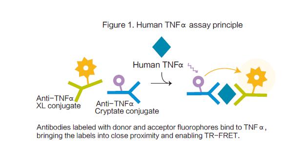 HTRF是由Cisbio試劑公司研發的多功能技術,用于檢測生物分子間相互作用。它結合了熒光共振能量轉移(FRET)技術和時間分辨熒光(TRF)技術,實現消除半衰期短的背景熒光。這個實驗應用供體和受體熒光染料。當供體和受體之間足夠近的情況下,由光源(如,高能閃爍氙燈)照射產生的供體激發光就會通過能量轉移機制到受體,反過來作為受體的特定激發波長。HTRF采用四個特定的熒光染料,可以組合成兼容的供體-受體TR-FRET對。供體為銪元素(Eu3+)和鋱元素(lumi4™- Tb),其長壽命熒光使它們可以應用在時間分辨熒光實驗中。兩種受體已經被研發用于HTRF實驗,分別是, XL665 and d2。都具有激發光譜重疊的HTRF供體的發射光譜。每個都在665nm有一個發射峰,但這個區域的波長并不能激發供體,或者激發非常弱。最早期的的HTRF受體,XL665,來源于紅藻的藻膽蛋白色素的純化。第二代受體,d2,是一種改進的別藻藍蛋白,比XL665小100倍,用來緩解可能發生在XL665檢測時的空間位阻問題。