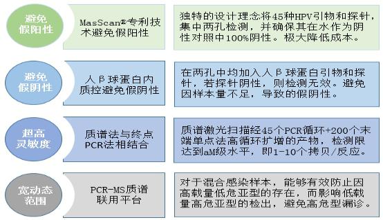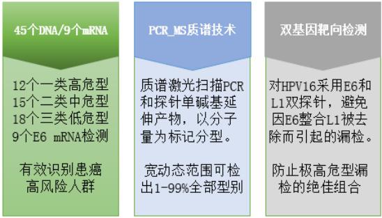 檢測原理:采用PCR_MS質(zhì)譜法,對單一標本分兩管檢測45種HPV DNA亞型。對9種高危型16,18,26,31,45,51,53,58和73型陽性樣本,可以進行HPV致癌蛋白基因 E6 mRNA活性檢測。