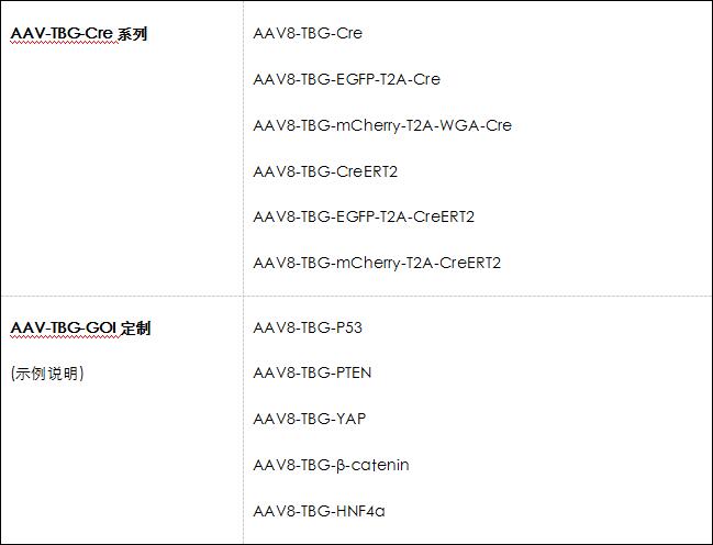 AAV-TBG-Cre/GOI相關產品& 服務: