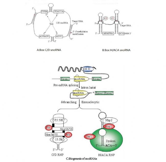 Fig1: The structure and biogenesis of snoRNAs. A. The 2′-O-methylated nucleotides located five nucleotides upstream of the D or D’ box sequences are indicated as red. B. Positions and consensus sequences of the conserved C, C’ box (UGAUGA), and D, D’ boxes (CUGA). The uridine residues selected for pseudouridylation are shown as. C. Biogenesis of snoRNAs :The great majority of mammalian box C/D and H/ACA snoRNAs are processed from pre-mRNA introns. snoRNAs families are not independently transcribed but processed from the pre-mRNA introns, in most cases by exonucleolytic digestion of the debranched lariat. Box C/D snoRNAs contain four evolutionarily conserved, essential proteins, fibrillarin (methyltransferase), Nop56, Nop58, and 15.5kDa. Proteins common to H/ACA snoRNAs include dyskerin (pseudouridine synthase), Gar1, Nhp2, and Nop10p[9].