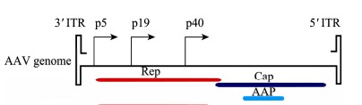 AAV最初是在純化的腺病毒液中發(fā)現(xiàn)的一種污染成分,故而得名。其復(fù)制增殖需要腺病毒或者皰疹病毒等輔助病毒的協(xié)助,所以AAV是一種復(fù)制缺陷型的病毒,歸屬于細(xì)小病毒科依賴病毒屬。AAV是無包膜的單鏈線狀 DNA 病毒,其基因組約4.7kb,兩末端為反向末端重復(fù)序列(inverted terminal repeat sequence, ITR),ITR 序列之間為病毒蛋白編碼區(qū),包含兩個(gè)開放閱讀框架,產(chǎn)生復(fù)制蛋白R(shí)ep、衣殼蛋白Cap和包裝激活蛋白AAP。