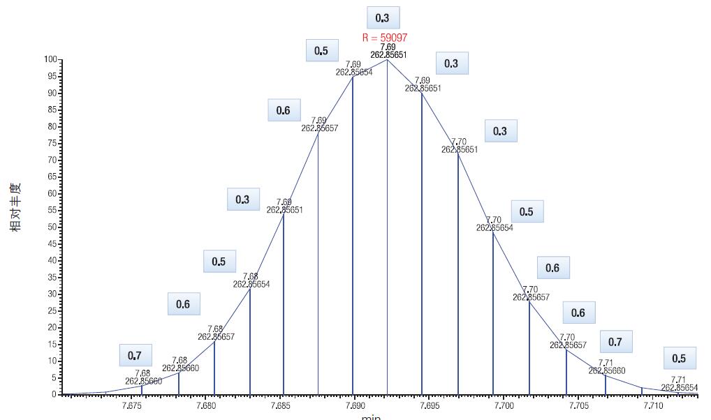 圖 2. 狄氏劑的提取離子譜圖(XIC)(m/z 262.85642,±2 ppm 質(zhì)量窗口),每峰 17 個掃描點(diǎn)(峰寬 2.4 秒)。數(shù)據(jù)采集在全掃描模式下進(jìn)行,分辨率為 60,000 FWHM (精確分辨率見紅字注釋)。每個掃描點(diǎn)測得的精確質(zhì)量及質(zhì)量差異(ppm)已標(biāo)注。