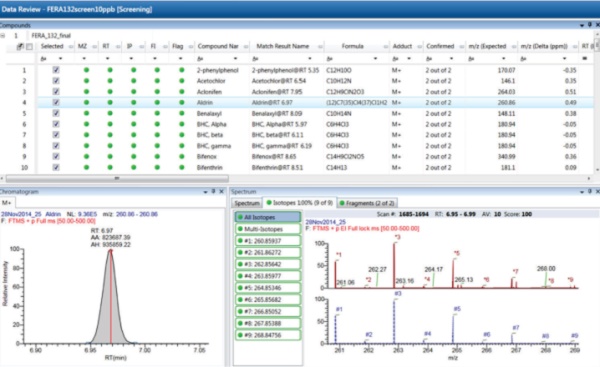 圖 3. 10 ng/g 樣本中確定鑒定出的農(nóng)藥顯示在 TraceFinder 軟件篩查結(jié)果瀏覽器中。化合物識別和確認(rèn)(以艾氏劑為例)的依據(jù)是準(zhǔn)確質(zhì)量(±2 ppm 質(zhì)量窗口)、 保留時間(RT)、同位素峰分布(IP) 和碎片離子(FI)。圖中可見測定的與理論的同位素峰。