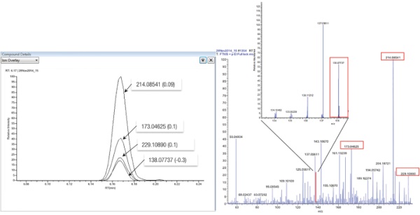 圖 4. 0.5 pg 特丁津(柱上濃度)的定量離子與三個確證碎片離子(左)的 XIC 疊加圖。每個離子的實(shí)測質(zhì)量及質(zhì)量誤差(ppm)已標(biāo)注。質(zhì)譜圖 (右)突出了定量和確證使用的離子,放大的區(qū)域顯示了強(qiáng)度最低的碎片離子(m/z 138.07737),檢測的質(zhì)量精度為 0.3 ppm。