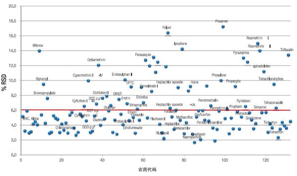 圖 5. 所有 132 種測定的農(nóng)藥在柱上5 或10 pg 濃度水平下的絕對峰面積可重現(xiàn)性 (% RSD,n=10)。圖示為平均 %RSD 值(實(shí)線)。