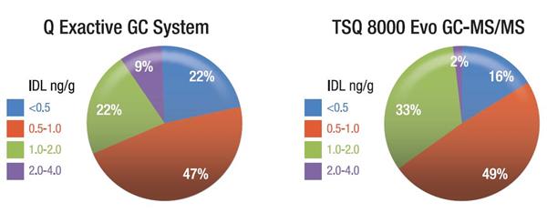 圖 6. Q Exactive GC 系統(tǒng) (左)與 TSQ 8000 Evo GC-MS/MS 系統(tǒng) (右)分析 5 ng/g 基質(zhì)匹配標(biāo)樣中 132 種農(nóng)藥的計(jì)算 IDL99(ng/g)值比較。圖中標(biāo)出了相對于目標(biāo)化合物總數(shù)(132)的農(nóng)藥百分比以及相應(yīng)的 IDL 區(qū)間。