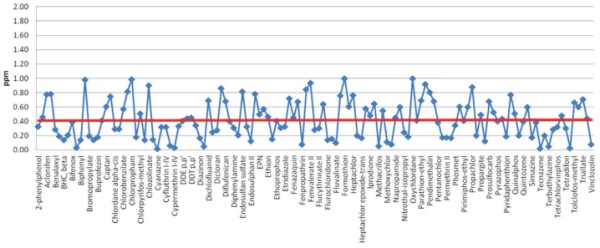 能夠持續(xù)穩(wěn)定測定準(zhǔn)確質(zhì)量的能力對于農(nóng)殘鑒定和利用儀器的分辨能力保持高度準(zhǔn)確將被分析物與基質(zhì)干擾的區(qū)分至關(guān)重要5。通過進(jìn)行一系列重復(fù)進(jìn)樣分析(n = 10)我們對所有 132 種農(nóng)藥檢測的質(zhì)量準(zhǔn)確度在 5 ng/g(或 10 ng/g,具體根據(jù)化合物確定)濃度水平進(jìn)行了評估。沒有任何被分析物的質(zhì)量偏差值超過 1 ppm,整體質(zhì)量準(zhǔn)確度的平均值為 0.4 ppm, 為檢測的準(zhǔn)確度和選擇性提供最大信心保障(圖 7)。
