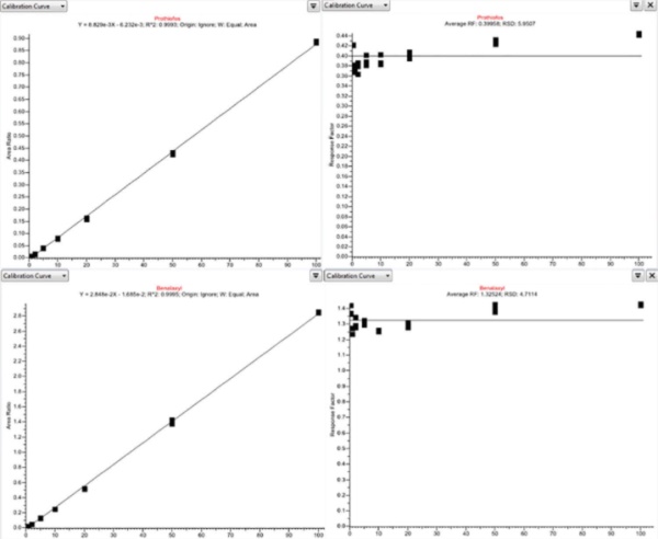 圖 8. 普硫松和苯霜靈在 0.5–100 ng/g 濃度區(qū)間內(nèi)的決定系數(shù)(左)和回歸殘差(%RSD)。