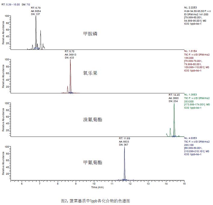 3.1.2菠菜基質中1ppb各化合物的色譜圖如圖2所示: