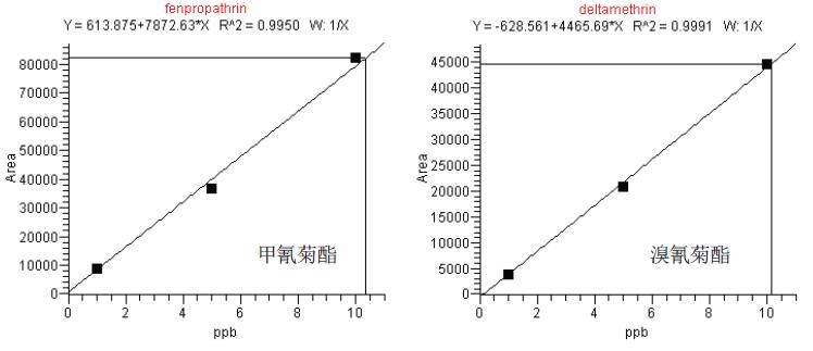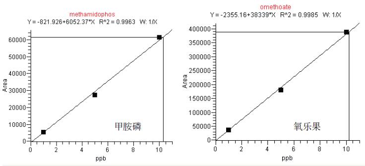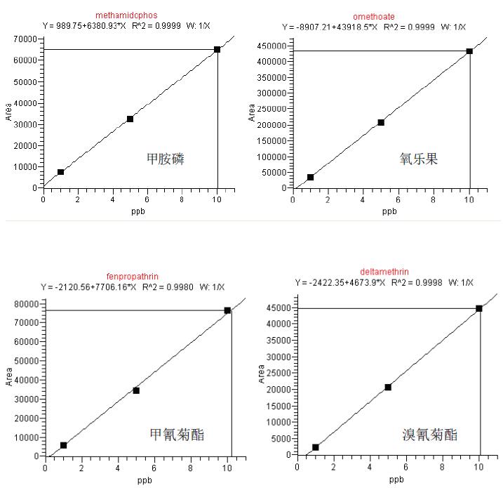 分別配置韭菜和菠菜基質中這4種農藥的梯度混合溶液,濃度分別為1ppb,5ppb和10ppb,建立標準曲線。這兩種基質中每種農藥的R2均大于0.995,表明線性良好。韭菜基質中各化合物的標準曲線如圖3所示:
