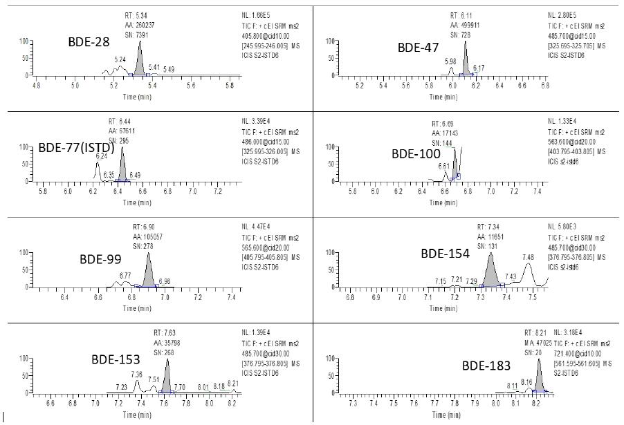 本方法采用ThermoFisher 公司全新一代三重四級桿質譜TSQ8000 測定水產品中7 種多溴聯苯醚的殘留,樣品提取率高,操作方便。儀器具有選擇性好,線性范圍寬,靈敏度高等優點。同時TSQ8000 提供的離子對掃描可以極大得去除假陽性的干擾,從而使檢測結果更加準確。在復雜基質中,儀器的相對標準偏差(RSD, n=7)為2.29-5.58%。該分析測試方法中所涉及的7 種多溴聯苯醚最低檢測限為0.1 pg/ul。完全可以滿足歐盟及各國對多溴聯苯醚類物質的檢測要求。