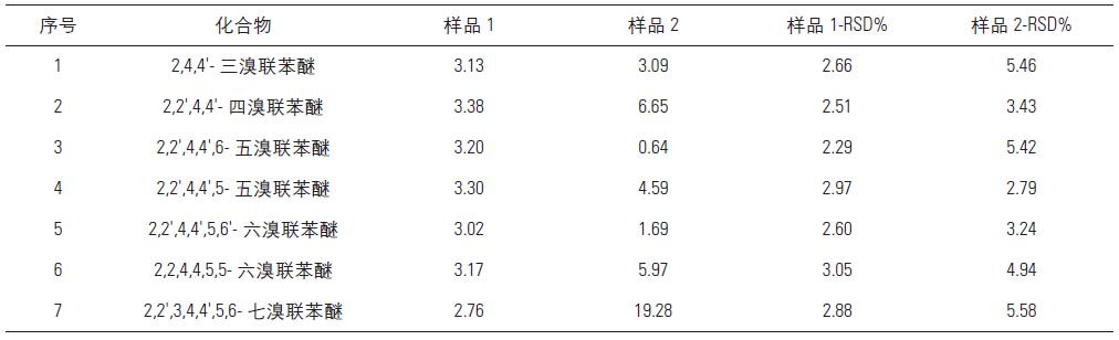 按照本實驗方法對2 個實際樣品進行分析檢測,并對每個樣品分別連續進樣7 針,計算每個化合物的相對標準偏差RSD%。實驗結果表2 表明,2 個樣品中均不同程度含有目標有機污染物,該測試方法的相對標準偏差(RSD, n=7)為2.29-5.58%。