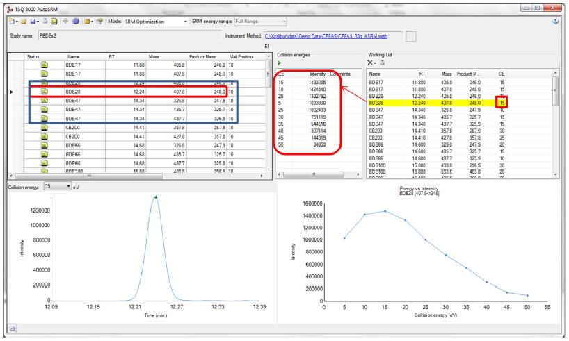 目標物二級質譜優化-AUTO SRM 效果展示:AUTO SRM 只需要配制目標物混標,全過程自動化進行,無需復雜的儀器方法編輯和數據瀏覽,優化結果直觀體現,特定化合物的特定離子對,按照碰撞能量進行優化,系統自動按照離子對響應的高低進行排序,我們只需要選擇響應最高的通道即可。見下圖所示,以BDE28 為例,