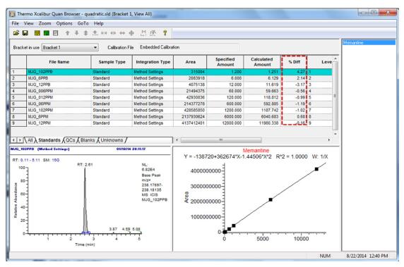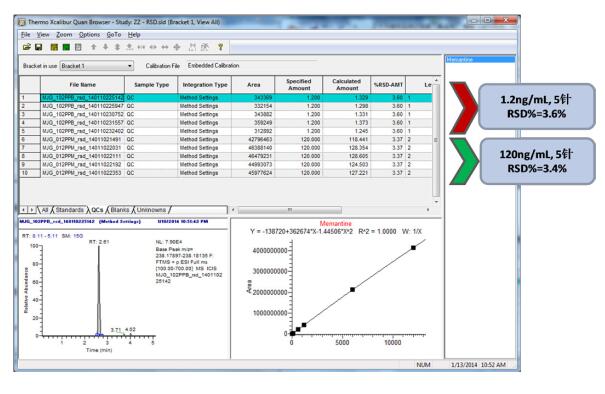 考察全掃描定量的線性范圍和重現(xiàn)性。 N-(二甲基金剛烷)甘氨酸的一級全掃描精確質(zhì)量數(shù) XIC 色譜圖, 1.2 ng/ml~12 µg/ml 標準曲線見圖 5, 1.2 ng/ml 和 120 ng/ml 兩個濃度下各 5 針精密度見圖 6。
