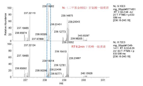從圖 8 一級質(zhì)譜數(shù)據(jù)中可以看出, 6.2 min 的峰中存在m/z238.014 的干擾離子,與目標雜質(zhì) N-(二甲基金剛烷)甘氨酸非常接近,僅相差 0.5 ppm,無法通過一級質(zhì)譜對兩者加以區(qū)分。