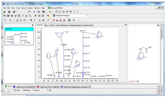 為更好的進行PRM定量,需要選擇出高質(zhì)量的定量子離子,采用 Q Exactive Focus 對目標雜質(zhì) N-(二甲基金剛烷)甘氨酸進行二級碎裂,在獲得了高質(zhì)量的二級質(zhì)譜圖后,將其導(dǎo)入專業(yè)的小分子結(jié)構(gòu)解析軟件 Mass Frontier 7.0,可快速準確的完成對不同碎片離子及其所對應(yīng)的結(jié)構(gòu)進行自動推測(圖 9)。