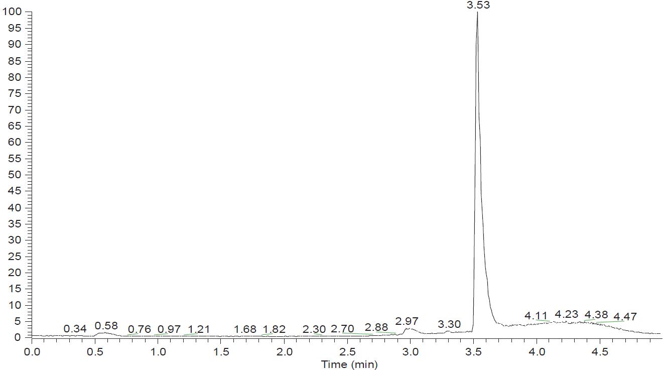 采用 5 min 的梯度分析,離子阱采集數據,寡聚核酸主要在 3.53 min 出峰。