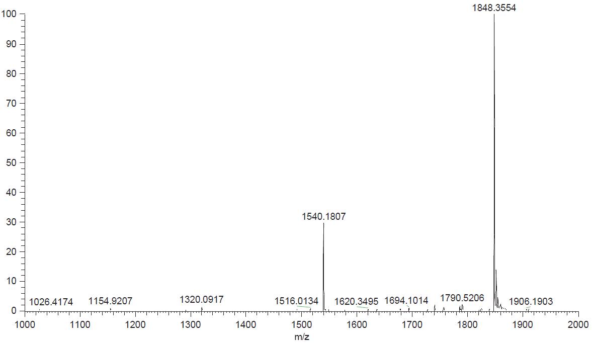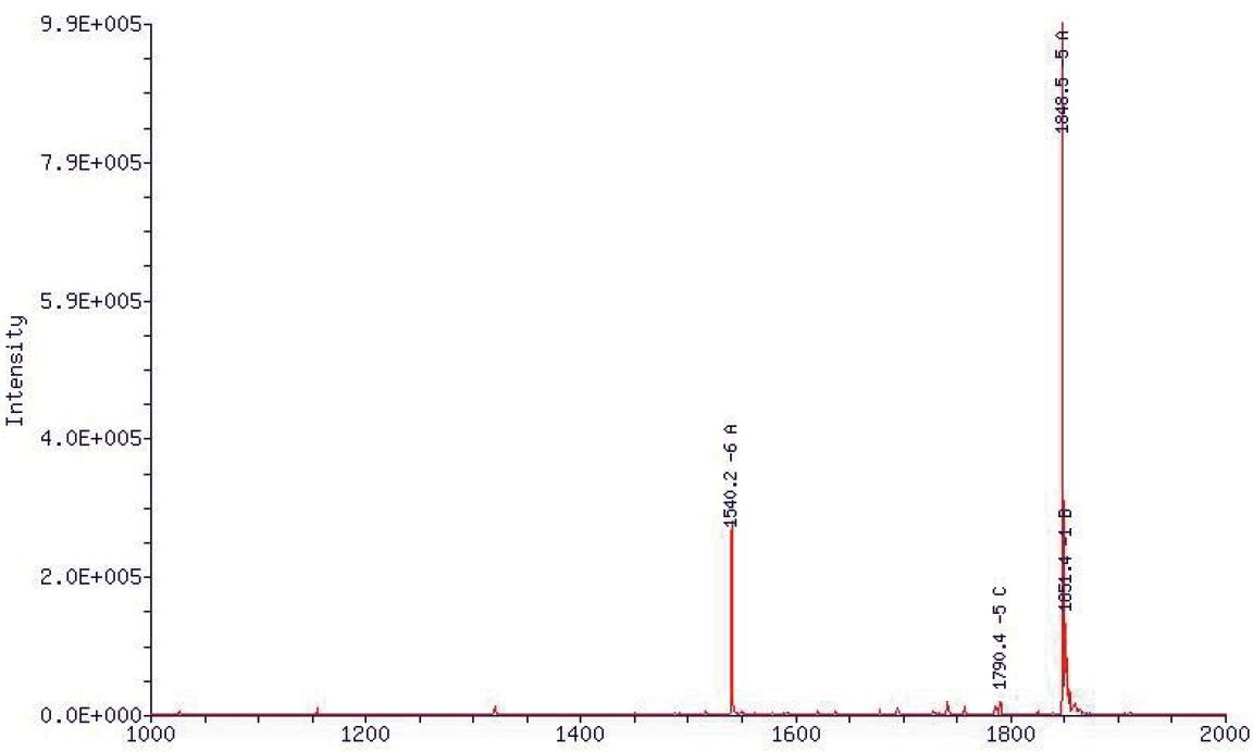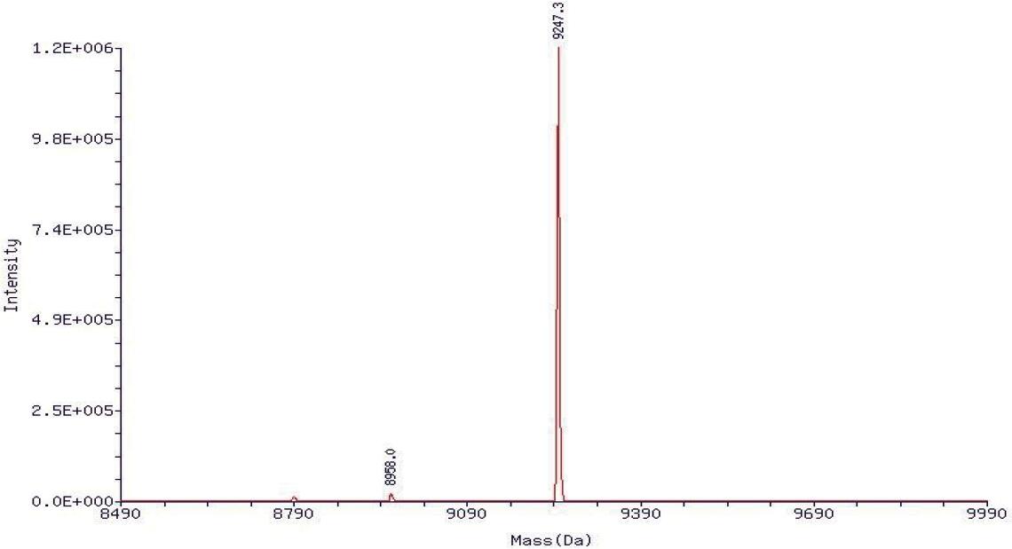 通過 ProMass 軟件去卷積之后的平均分子質量為 9247.3,與理論的平均分子質量完全一致,并且 ProMass 軟件對原始質譜圖中質譜峰的電荷進行了歸屬,如下所示,質荷比為 1540.2 的質譜峰對應的電荷為 –6 價,質荷比為 1848.5 的質譜峰對應的電荷為–5 價。