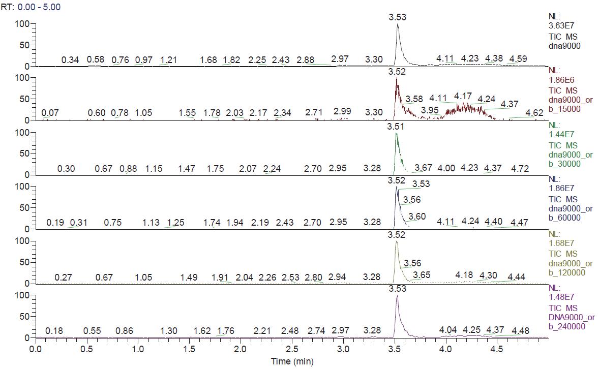 與低分辨的實驗相比,在保持上樣量和色譜條件不變的前提下,僅僅改變質譜采集的分辨率,可以看到寡聚核苷酸的色譜保留時間不變,基本在 3.52 min 出峰,不過隨著質譜檢測器分辨率的提高,原始質譜圖發生了顯著的變化,如下所示,當使用線性離子阱 LTQ 作為質量檢測器時,只檢測到一個大包峰,無法分辨電荷;當使用 Orbitrap 作為質量檢測器,分辨率 R 設置為 15000 時,同樣也只檢測到一個大包峰,電荷仍然無法分辨;當使用 Orbitrap 作為質量檢測器,分辨率 R 設置為 30,000 時,可以觀察到一些同位素峰,電荷可以實現分辨;當使用 Orbitrap 作為質量檢測器,分辨率 R 設置為 60,000 時,可以觀察到稍微好一些的同位素峰,但無法完全分離,電荷同樣可以實現分辨;當使用 Orbitrap 作為質量檢測器,分辨率 R 設置為 120,000 時,同位素峰可以實現完全分離,電荷同樣也可以實現分辨;當使用 Orbitrap 作為質量檢測器,分辨率 R 設置為 240,000 時,同位素峰可以實現完全分離,并且峰形更加尖銳,電荷同樣也可以實現分辨,由此我們可以準確的計算得到寡聚核苷酸的單同位素質量和平均質量,最后的實驗結果與理論預測的分子質量保持完全一致。