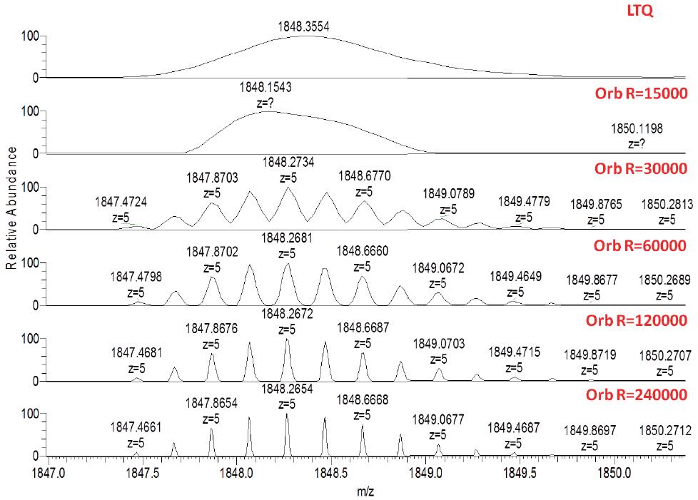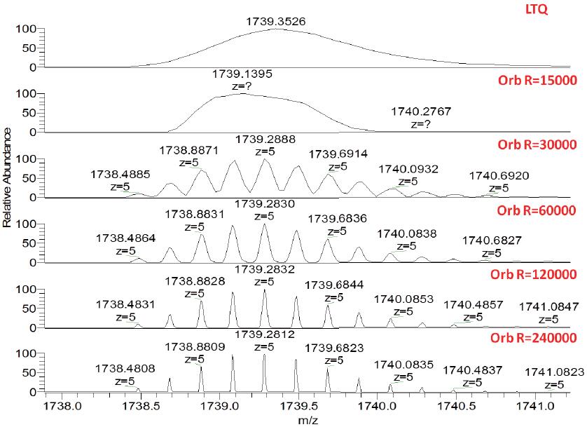 從上面的質譜圖中,可以看到,隨著質譜分辨率的提高,寡聚核苷酸的同位素峰可以實現完全分離,并且峰寬更窄,電荷也可以實現完全分辨,并且無需軟件輔助,就可以直接計算得到寡聚核苷酸的單同位素質量和平均分子質量,使得寡聚核苷酸的分析測試更加快速和直接。