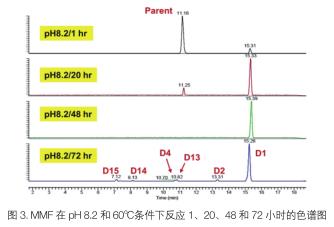 • 用如上 pH 2、pH 6、pH 8 的溶液和過(guò)氧化氫(3%,pH 8.2)將濃度為 2.5 mg/mL 的霉酚酸酯儲(chǔ)備液稀釋 10 倍配制濃度為0.25 mg/mL 的強(qiáng)制降解溶液。強(qiáng)制降解溶液放置于60℃烘箱中。在放置的第 1、20、48 和 72 小時(shí)分別取樣,直接進(jìn)樣到 LC/MS 中進(jìn)行分析。