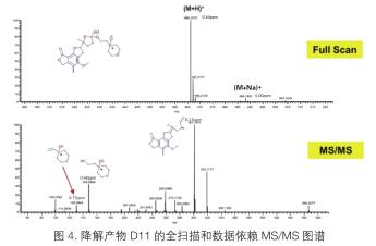 1.UHPLC- 高分辨率 MS 快速測(cè)定降解產(chǎn)物采用 UHPLC- 高分辨率 MS 快速分析降解產(chǎn)物。高質(zhì)量的HRMS 全掃描圖譜為測(cè)定降解產(chǎn)物的元素組成提供了重要信息,并從隨后的數(shù)據(jù)依賴 MS/MS 獲得分子離子的裂解信息。