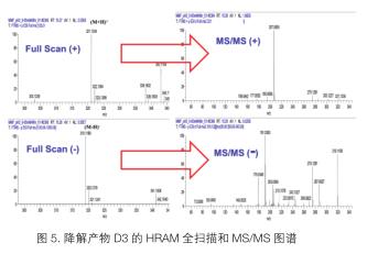 本文采用高分辨臺(tái)式質(zhì)譜儀 Q Exactive Focus 開(kāi)發(fā)了一種快速可靠的分析霉酚酸酯降解產(chǎn)物的完整工作流程,采用HRAM全掃描和數(shù)據(jù)依賴 MS/MS 在高分辨率和極性切換模式下實(shí)現(xiàn)降解產(chǎn)物的快速鑒定。HRAM MS 和 MS/MS 譜圖以及正/負(fù)離子模式切換,能可靠完成降解產(chǎn)物的定性和結(jié)構(gòu)鑒定。