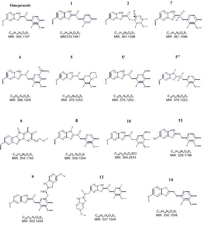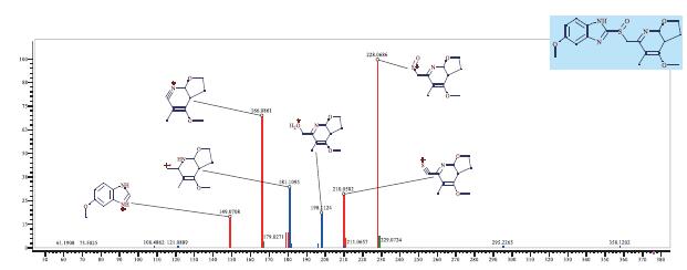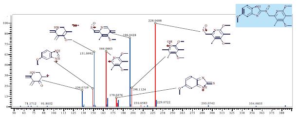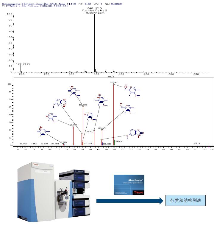 為了展示HR-MS 在雜質分析和結構鑒定方面的能力,本文選用了市售藥物奧美拉唑。本研究采用了賽默飛世爾科技的Q Exactive 臺式Orbitrap 質譜儀和數據處理軟件Mass Frontier 來快速分析和鑒定奧美拉唑中雜質的結構。