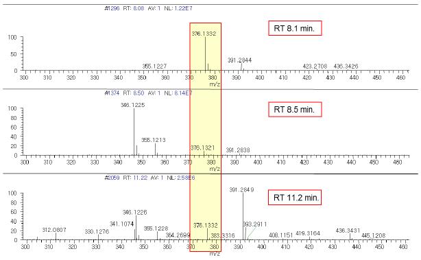 圖4. m/z 為376.1331 的雜質的三個同分異構體