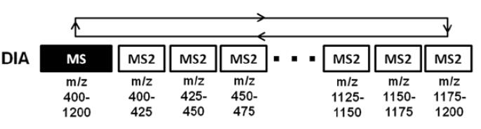 DIA 通常將 m/z 400–1200 的全掃描范圍分割為 25 m/z 的窗口(共 32 個窗口),依次(m/z 400-425、m/z 425-450、……、m/z 1175-1200)將窗口內(nèi)所有的離子選擇、碎裂,并檢測該窗口內(nèi)離子產(chǎn)生的所有碎片,一次循環(huán)獲得 32 張二級譜圖,并不斷循環(huán)往復(fù)地進(jìn)行采集(圖 3)。