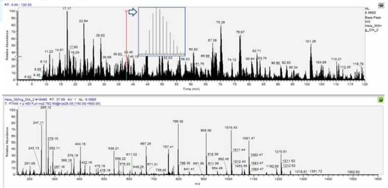 典型 DIA 數(shù)據(jù)如圖 10 所示,從色譜圖上看 DIA 數(shù)據(jù)與傳統(tǒng) Shotgun 數(shù)據(jù)沒有明顯區(qū)別,只是每個循環(huán)的二級譜圖數(shù)量固定,因此掃描點分布均勻。