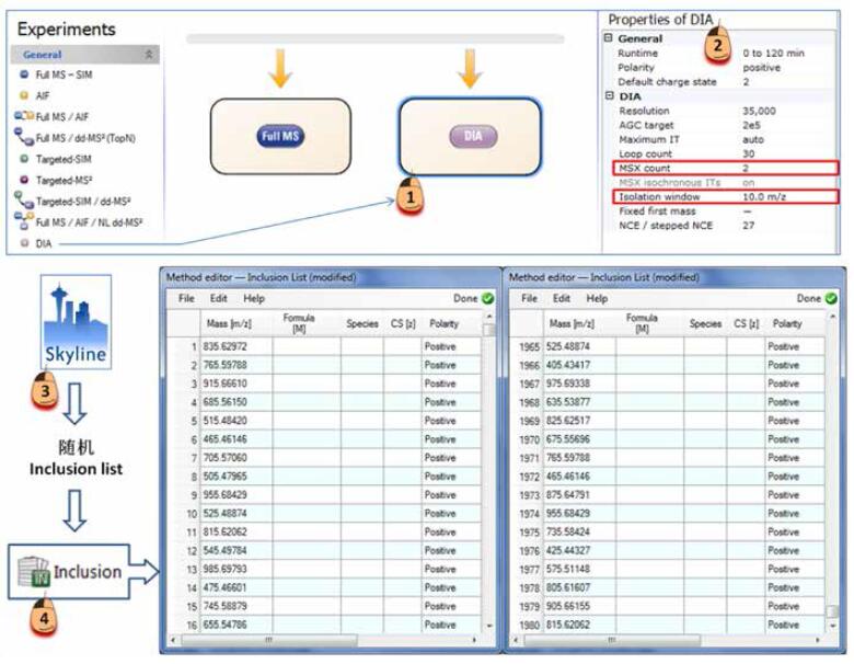 Orbitrap 具有的獨一無二的 msxDIA 方法設(shè)置同樣簡單易用,只多一步隨機(jī) Inclusion list 生成(圖 11): (1) 在模板中將 DIA 模塊拖入方法流程(若加入一級掃描,則在 DIA 模塊前拖入 Full Mass 模塊);(2) 以 2 x 10 m/z 為例,DIA 模塊中的 MSX count 設(shè)為 2,窗口寬度設(shè)為 10 m/z ,即完成 2 x 10 m/z 模式參數(shù)設(shè)置;(3) 使用 Skyline 軟件生成隨機(jī)的 Inclusion list 表;(4) 將隨機(jī) Inclusion list 表導(dǎo)入方法的 Inclusion list 中,完成方法設(shè)置,即刻可以開始 msxDIA 數(shù)據(jù)采集。